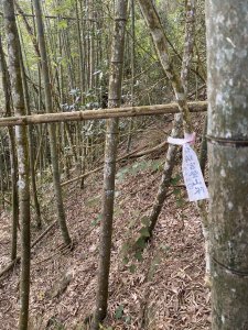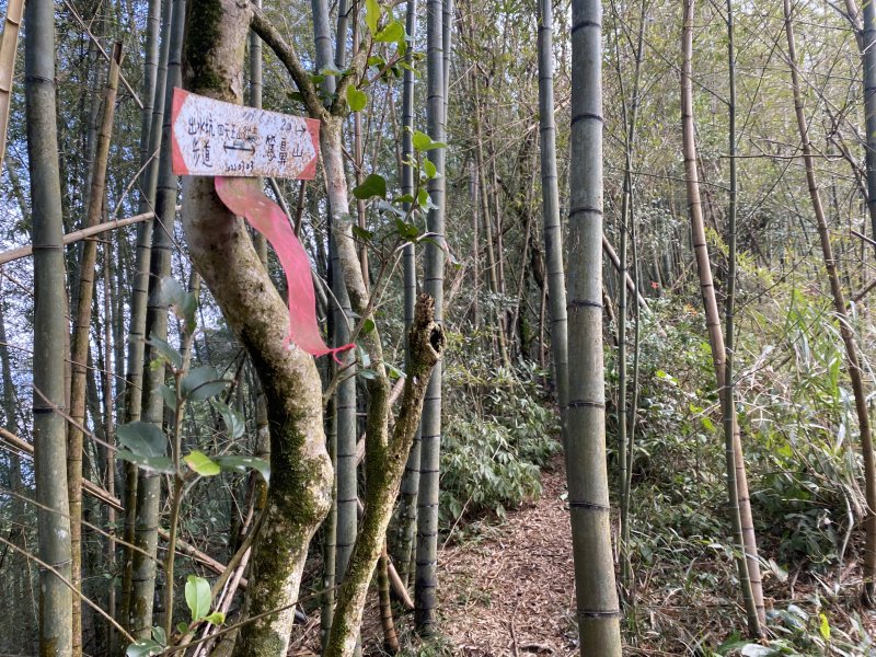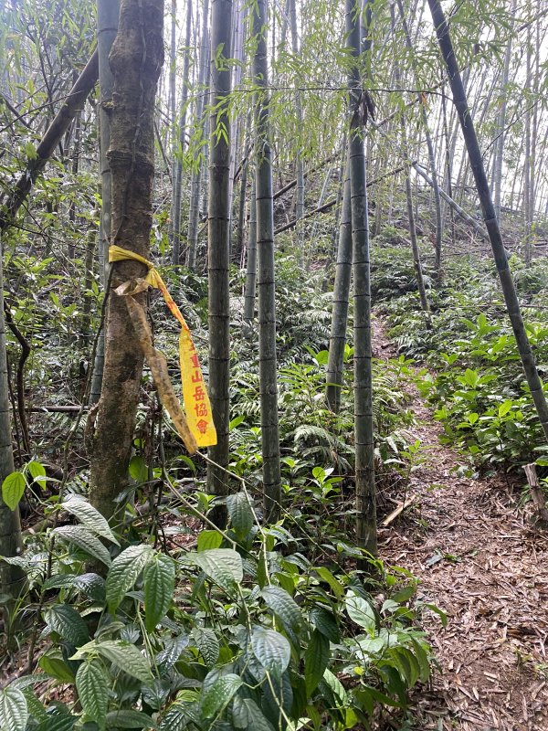 沿著綁繩續前往青園的山頭,心生猶豫,八八風災後倒竹雜林擋路加上今年林中陰雨迷棉造成路基流失較多且綁條並不清楚,決定沿原路回出水坑步道,幸運地搭到回程嘉義縣公車110號下山