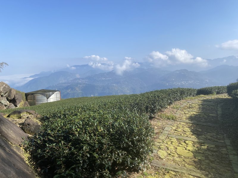 雲層下方茶園景緻整齊化一,像是設計過的布景