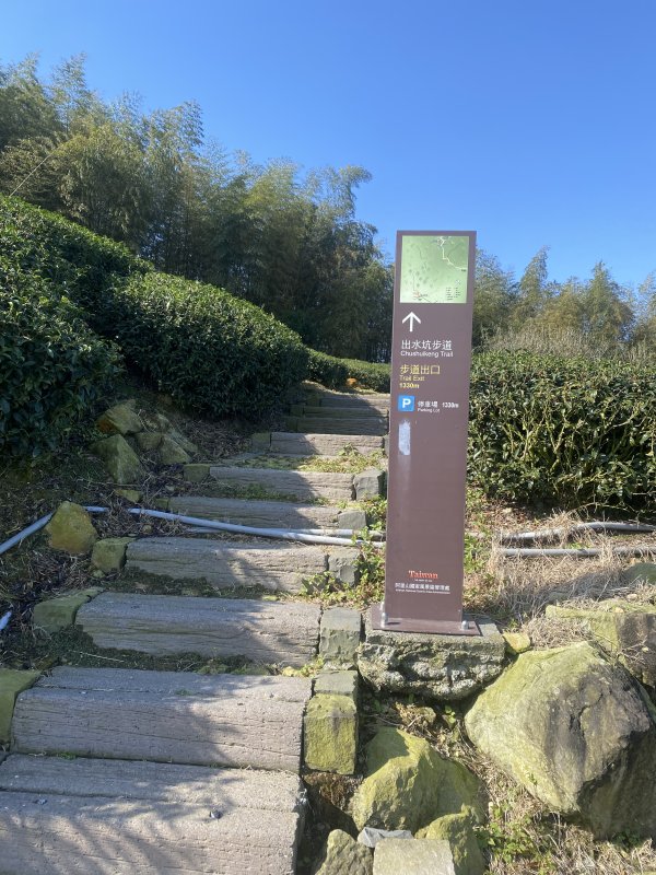出水坑,步道全長約1400公尺,部分與早期青石階砌成的古汗道相疊,沿線孟宗竹及桂竹茂盛,行走其間,常有「空山不見人,但聞人語響」說法;果然未見山友,僅有小黃狗與茶農。