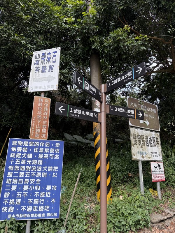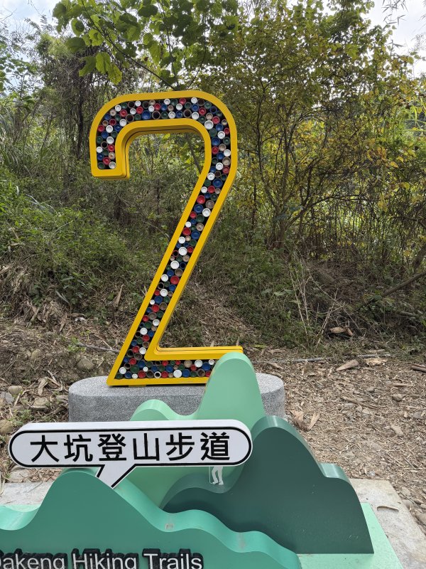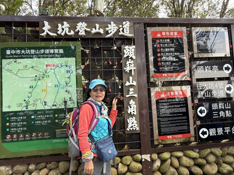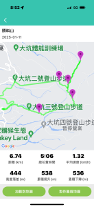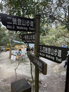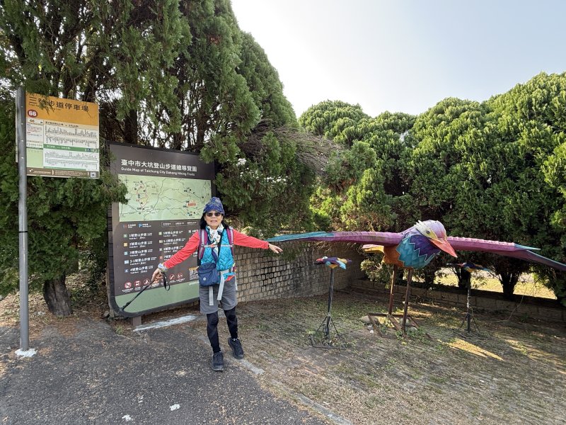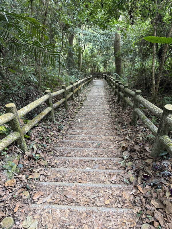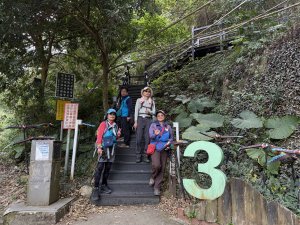 自駕到3號步道停車場 有公厠 停車場→3號步道口叉→3號步道登山口→圓枕木棧道→吊橋→5號步道叉平台→五葉松→頭嵙山→回五葉松→5號步道叉取右→高峰亭→黑松亭→茶歇亭→城中亭→二嵙山→回黑松亭取右下→怡樂亭→2號步道→巧遇山大王→水泥階梯→2號步道口→接產道取左O回3號步道停車場