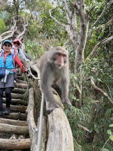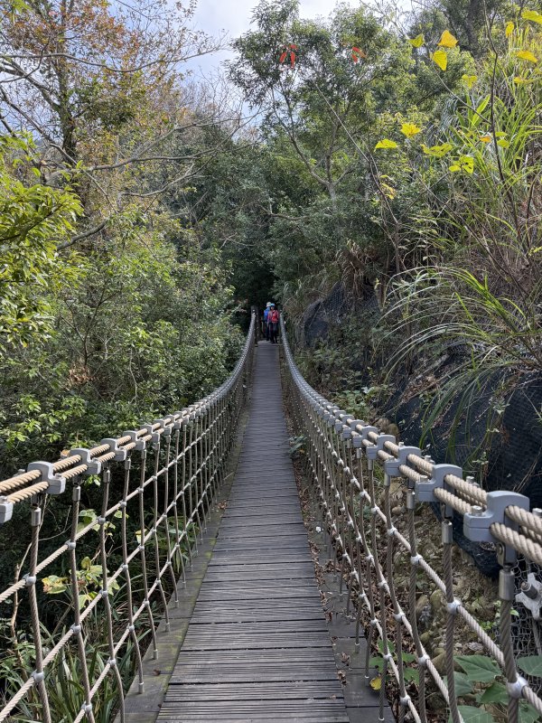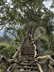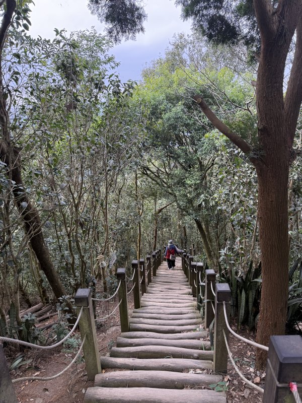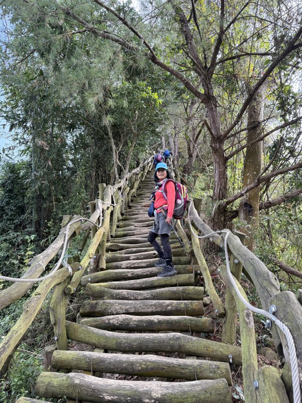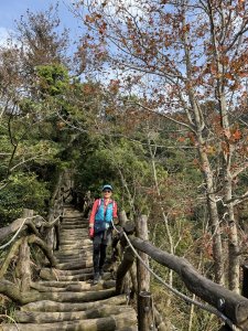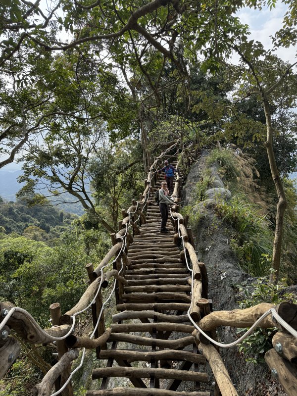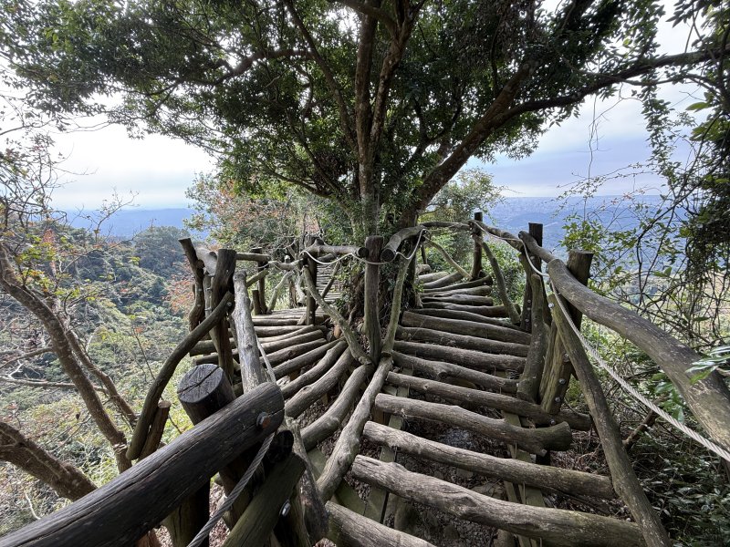 圓枕木棧道 最好不要用登山杖 可以用雙手(帶手套)扶住兩側鋼繩 留心腳下的圓木