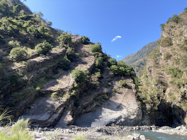 年假來到最近很紅的北港溪峽谷,目前有施工便道所以非常好走,也有很多人開車、騎機車、騎腳踏車進去,感覺裡面像個菜市場,所以也沒有打算在裡面扎營,只是年假的住宿真的貴貴的,連之前去住的背包房都變成原本的三倍價,幸好隊友找到一家便宜的背包房,至少走完還可以在埔里休息一下不用連夜趕回台北,北港溪峽谷之所以最近會這麼熱門,是因為最近有修築能高大圳的工程便道,工程好像是約五年會進行一次,沒有工程便道當然也能進去,只是難度會從散步變成溯溪,再加上峽谷地形不適合雨季前往,所以最近是去的最好時機。一早從台北開車前往惠蓀林場,車子停在柑仔店停車場附近,然後步行至投80/13K的里程牌附近,前往平台區林道,順著路走會看見鐵閘門,這邊也是很多休憩步道的交會點,穿過閘門後隨著水泥路一路往下,穿過清翠橋後續行抵達溪底,然後往上游前進一直走到施工處,單程約10km垂直落差約為300m,慢慢走含拍照單程大約3hr,途中要穿過幾次溪流,不過目前的狀況可以踩著石頭前進不會濕腳,反倒是機車或腳踏車有些水窟只能硬突破可能會弄濕鞋子,一路走到最後能高大圳的施工處,工人用怪手擋住道路,我們就走到這邊沒有再往工作站前進。沿途風景真的是超漂亮,剛開始有被山環繞的感覺,抵達溪底看見兩側巨大岩壁跟各種巨大石頭,還有各式奇特的石洞,目前是一條路線簡單風景很好CP值極高的步道。