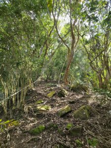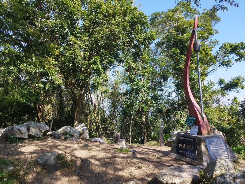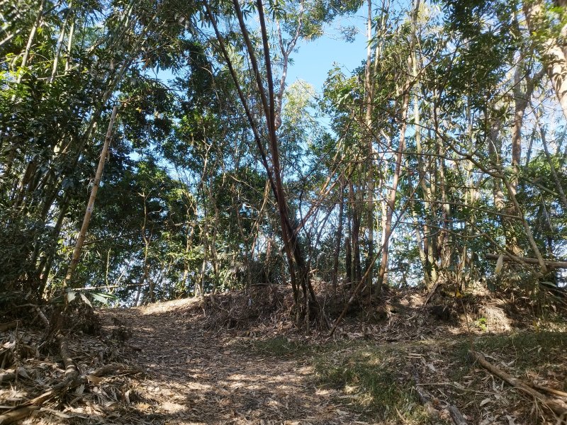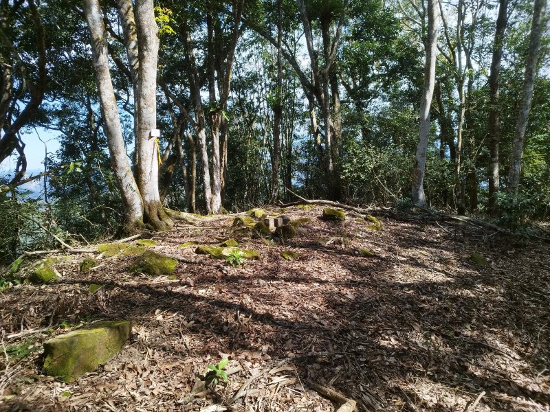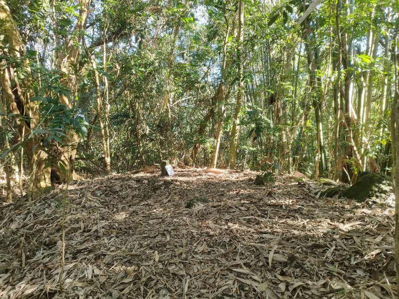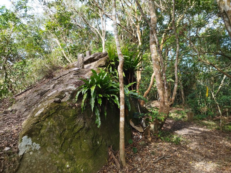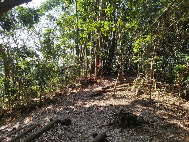 六義山步道百葉端~17(不用五分鐘就到達南峰。竹叢旁綁紅膠帶的地方就是基石位置,心想奇怪怎沒看到方形柱石,靠近查看原來是自然石)