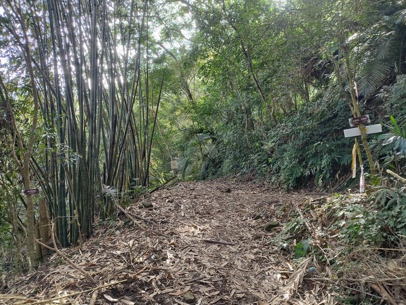 西阿里關山南化端~3(產道岔路點。左上往茅山,直行往西阿里關山。座標23.205608,120.644057)