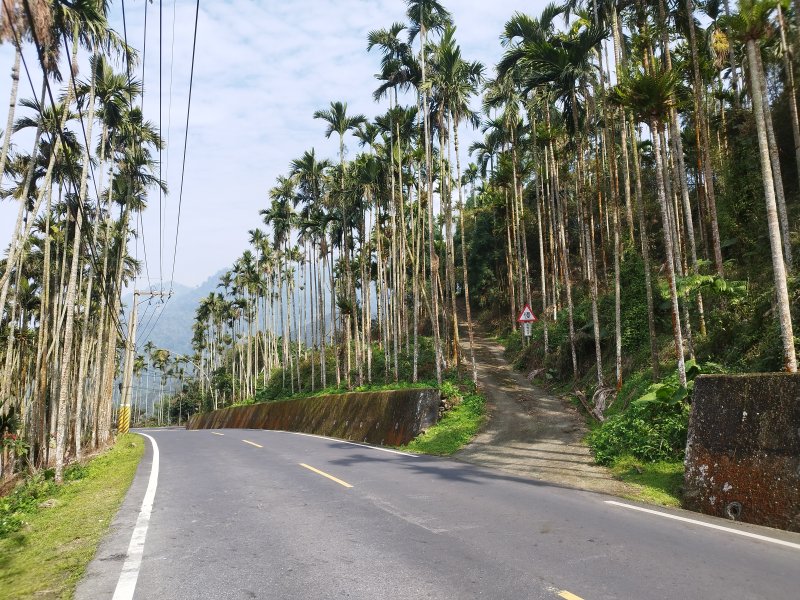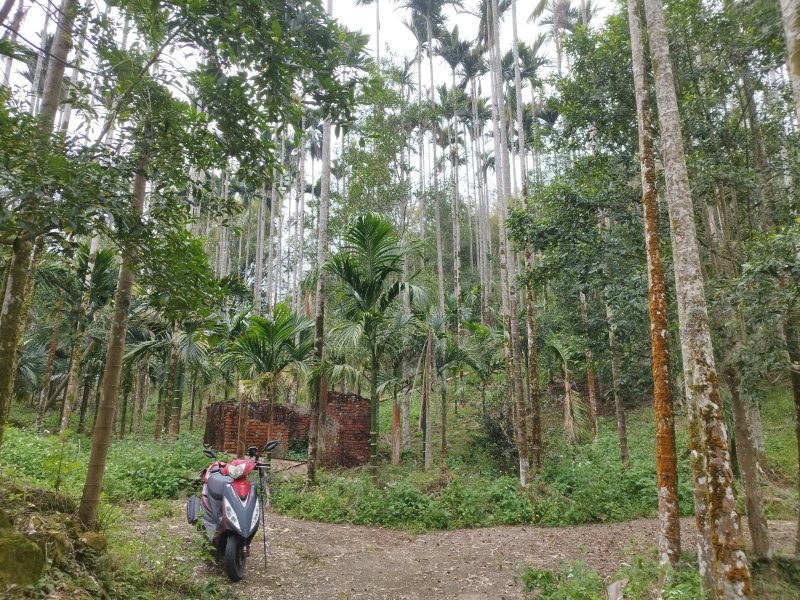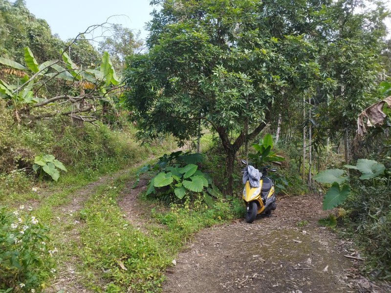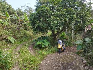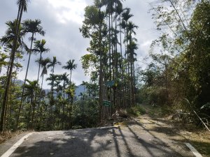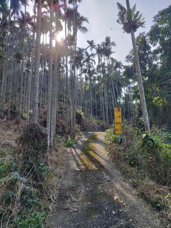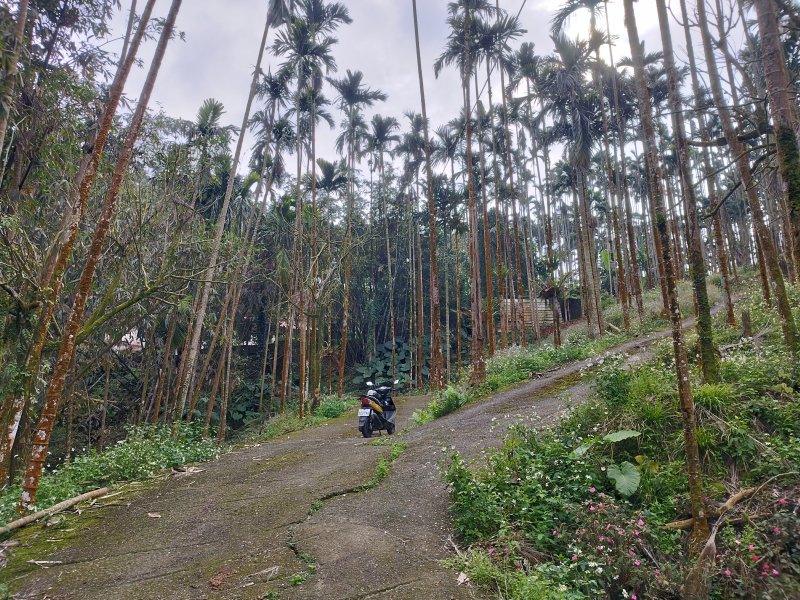 (中埔)七分寮~5(機車直達往基石的產道岔路處,右邊的檳榔樹上有貼黃色膠帶與路條)