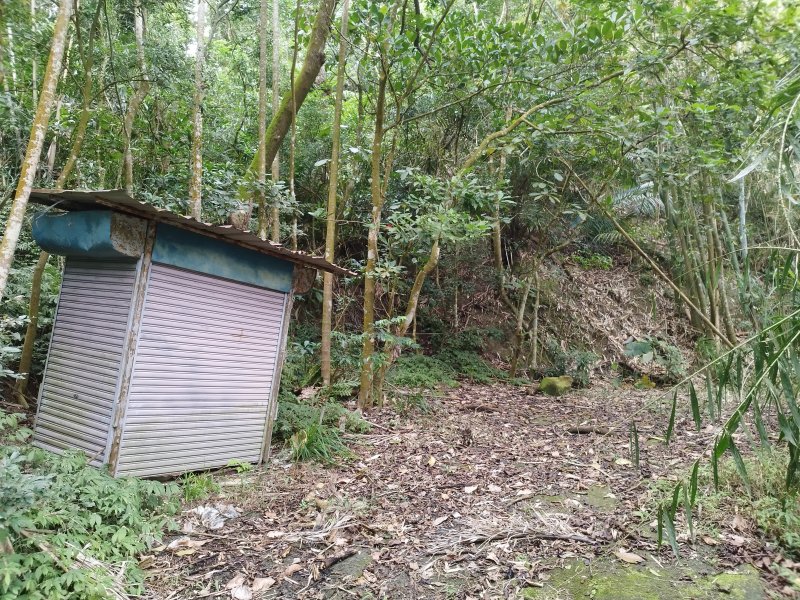 頭凍家族~23(鐵皮屋岔路口,這邊要左轉,鐵皮屋旁的樹幹上有綁黃色膠帶。右邊續行產道應該也是能到達山頂,但路況可能很差)