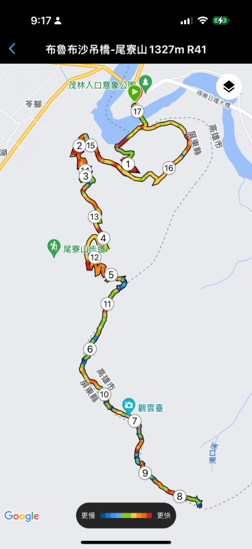 過布魯布沙吊橋回到停車場,全程17K, 爬升1327m 。