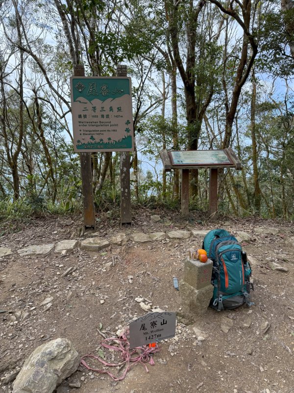 8.3K, 爬升1297m 抵達尾寮山:海拔1427M,小百岳#073,二等三角點,位於屏東縣三地門鄉與高雄縣茂林鄉交界。休息6分鐘,10:43下山。