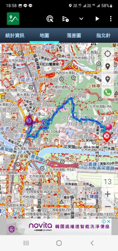 劍潭山,老地方,大直捷運站 Betty Shen 2025-02-23 發表 1,825 次點閱 9 次拍手 拍個手吧 收藏 檢舉 分享 分享至 Facebook LINE 一日行程 出發日期 2025/02/23 回程日期 2025/02/23 相關路線 劍潭山親山步道 相關山岳 老地方 、劍潭山 本文為網友的心得,以下內容不代表健行筆記立場。 Day 1 2025/02/23 16:25 劍潭捷運站起登 16:34 牌樓 16:39 一路階梯上 16:41 往大忠宮方向 16:42 大忠宮 16:45 雲霧裡的101 16:46 AED已普及 16:52 甲蟲生態區 16:56 打印台,也有AED 16:59 劍潭山,小百岳 17:10 六美,看繁華台北 17:12 七美,觀音夕照 17:13 今天觀音躲在雲霧中 17:17 老地方 17:18 老地方 17:19 旁邊山徑拉繩下 17:20 抬頭看觀飛機平台 17:23 回首來時路 17:28 下到涼亭,回到步道 17:33 有步道,有坡道 17:34 還有機車騎上來 17:38 通北街登山口 17:52 繞行實踐大學後方 18:08 小館子晚餐,酸白菜豬肉麵 18:34 大直捷運站,也可續行往植福宮,搭公車回圓山捷運站 18:58 軌跡https://hiking.biji.co/index.php?q=trail&act=gpx_detail&id=4263015
