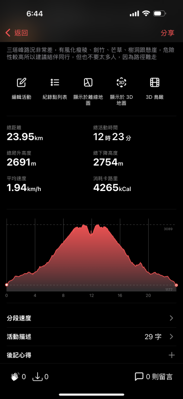 行徑紀錄 總距離26-27公里 總爬升2700-2800公尺