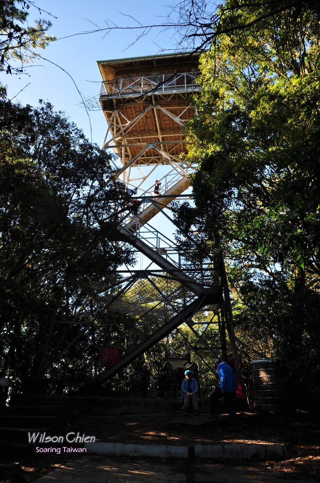 在塔上觀望著來時路而鳶嘴山的山型與特徵很貼切, 那紅色一片就是剛剛的楓紅搖滾區
