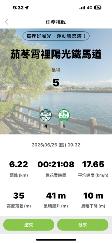 霄裡好風光親子自由行 丁美珍 2025-06-30 發表 196 次點閱 5 次拍手 拍個手吧 收藏 檢舉 分享 分享至 Facebook LINE 親子 出發日期 2025/06/26 回程日期 2025/06/30 相關路線 大㓓森林公園 、新屋綠色走廊自行車道 、茄苳霄裡陽光鐵馬道 、霄裡玉元宮 、石母娘娘廟 、永安海螺文化館 、青年體驗學習園區 、永安漁港商區 本文為網友的心得,以下內容不代表健行筆記立場。 Day 1 2025/06/26 騎在鄉野間,涼風徐徐吹來,聽著蟬鳴鳥叫聲真讓人感到放鬆。 Day 2 2025/06/27 09:48 忠貞文化園區雖然不大,但可好好聽當地講解,再去吃碗美味的米干 Day 3 2025/06/28 11:03 大㓓森林公園適合親子活動的好地方。放慢腳步去觀察公園內躲在樹林間的各種鳥類。 Day 4 2025/06/29 15:04 永安漁港的海螺館,裏面有許多海洋相關的互動軟體,也很適合親子活動。 Day 5 2025/06/30 16:00 新屋綠色隧道,要注意防曬與水份的攝取喔