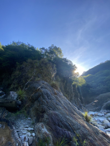 終於來到塔次基里溪溪邊(立霧溪)。我們看別人的紀錄,溪谷都是藍色很美、很平靜的,不像我們眼前看到來勢洶洶、又灰又湍急的樣子。只能說我們運氣特別好XD