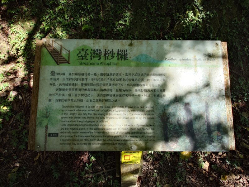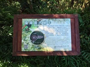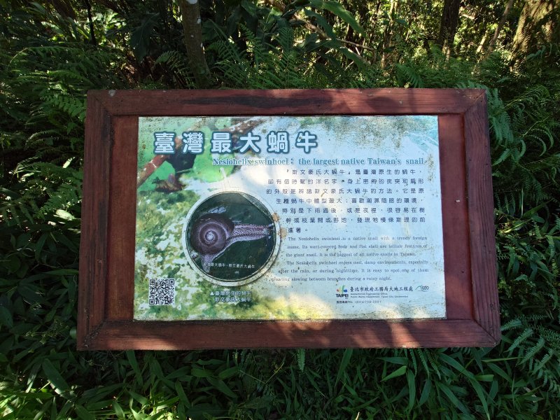 台灣最大原生蝸牛,斯文豪氏大蝸牛。 解說牌立在步道旁。