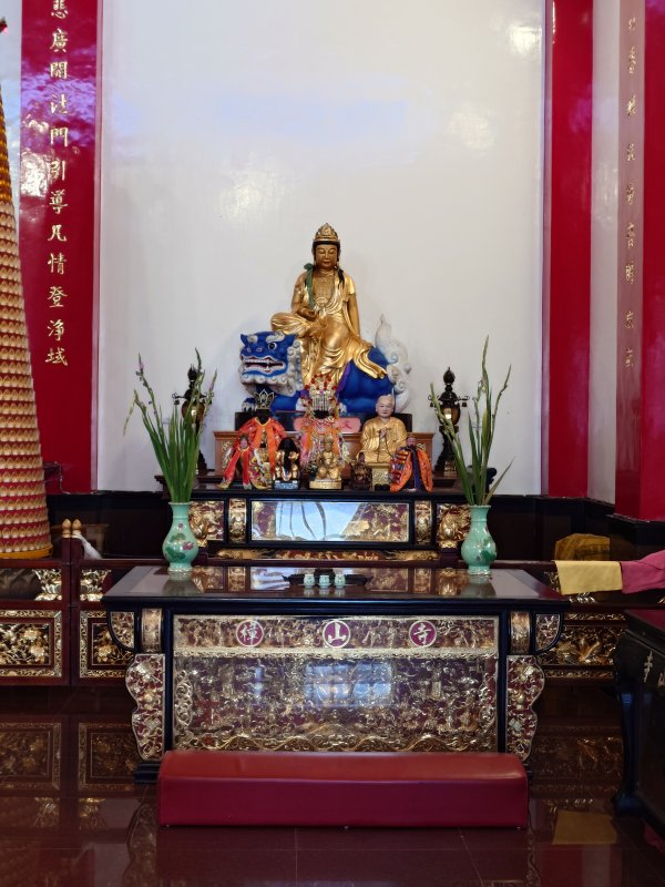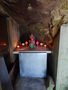 樟山寺主祀千手觀音,寺方有提供茶飲,可自行取用。我往左邊陪祀位確認神像中的一尊,應該是空海和尚。