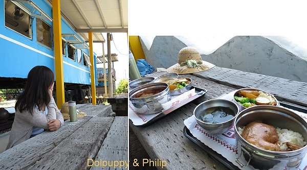 前兩次光顧都客滿,這次也不例外,但想想車廂內沒有空調,又悶熱又充滿便當味,好像也不是舒服,最後我們決定坐在車廂外的座位,結果這個決定是對的,坐這裡用餐其實比車廂內舒服,而且一樣可以看海。餐點是鐵路便當套餐,當然比一般便當還貴,不過這裡是景觀餐廳,又附飲料,這樣的價位也就算平價囉,重點是我個人覺得主菜配菜都很好吃,附上的綠茶和紅茶也都很香。