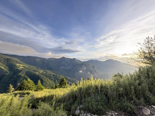 不用再等隊友後,就可盡全力向前。出名的哭坡其實不哭(要哭的在後面,哈),五點多即到雪山東峰,正好日色初出,雖有厚厚的一層雲垛,但未曾遮掩雄混的聖稜線展現。在此駐足賞日光與月色共舞的景象,天空光影乍現,晨暉彩雲在層巒上漸層交錯,心中豪氣因而被激發,心想天時地利都有了,一定要走到主峰。