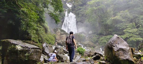 站在瀑布前,水霧瀰漫周遭,好像下著毛毛雨.