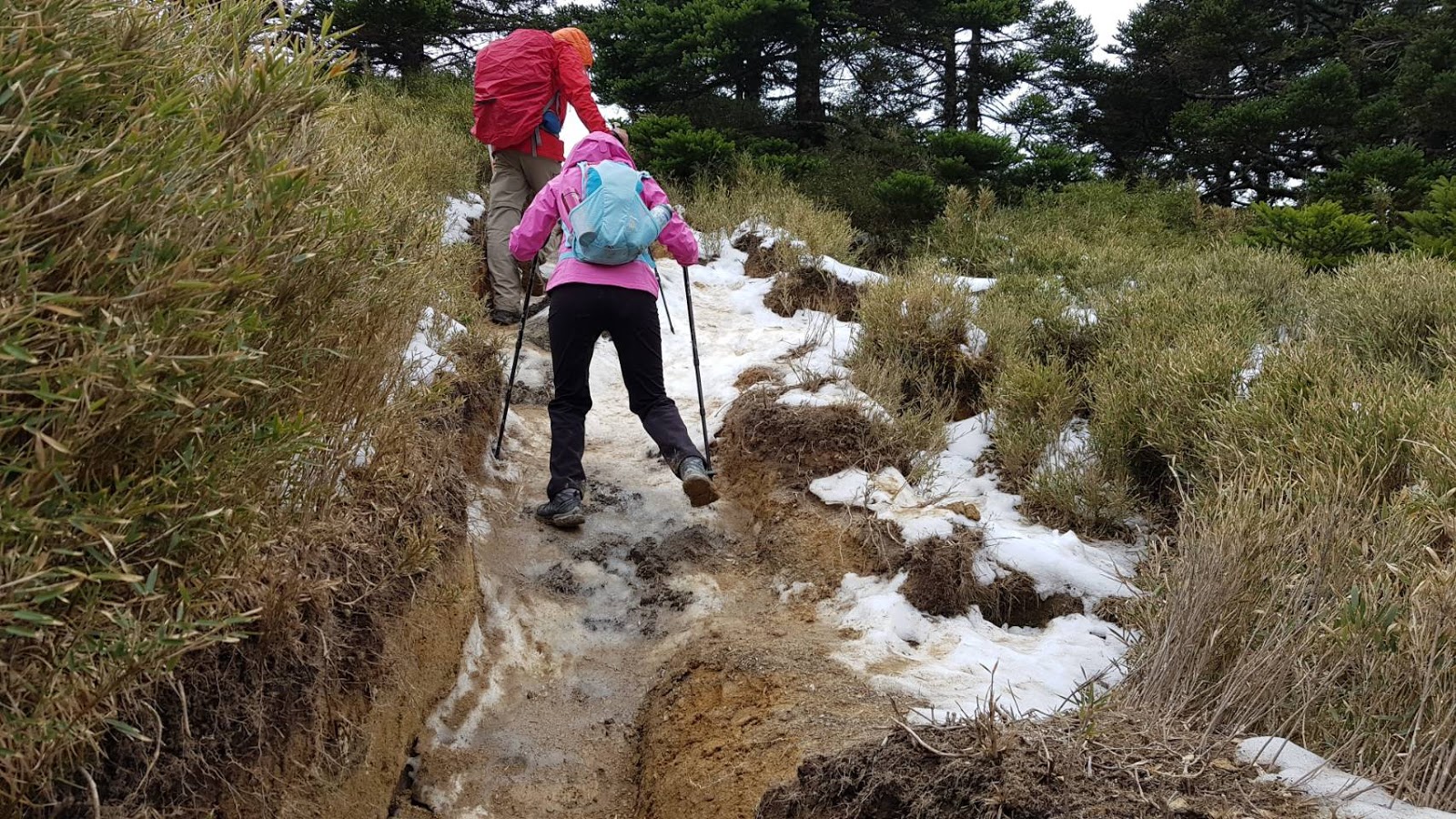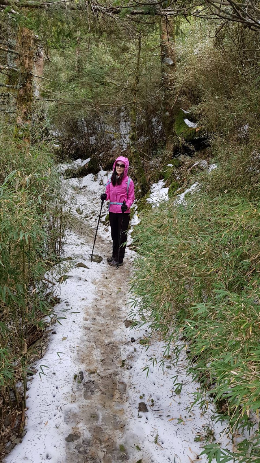 出發前因此打電話知道有結冰,結果實際冰爪跟用不到,所以冰爪加岩盔等於多拿來加重訓練的,加上我們全部自理,所以這2天下來也讓丫詮和凱雲一路喊腿好酸(話說喊著喊著也是走完了XD),或許除了前年帝王寒流外,奇萊南華這邊是不用帶的,因為實際觀察,好像也真的只有我們有帶而已,搞笑了。