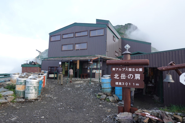 下午兩點半左右,終於抵達了今天的紮營地──「北岳肩ノ小屋」,據路上山友所說,肩小屋的伙食不錯,尤其是白飯可以吃到飽更是一絕,我們沒有這個口福,先到山屋辦理紮營登記之後,趕快到營地紮營準備睡午覺去。肩小屋的營地範圍還滿廣的,建議在面對山屋前左側紮營,如果離太遠的話不論上廁所還是裝水都滿不方便的。