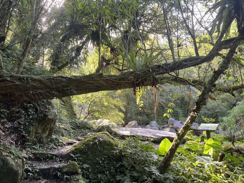松羅步道長約 2 公里,海拔介於 280 至 400 公尺之間,落差不大,行走難度低,卻擁有國家級的原始林相與自然史景觀:巨石錯落、樹梢藤蔓交織,遠山煙嵐環繞,溪流湍急作響,充滿了視覺與聽覺的雙重饗宴。