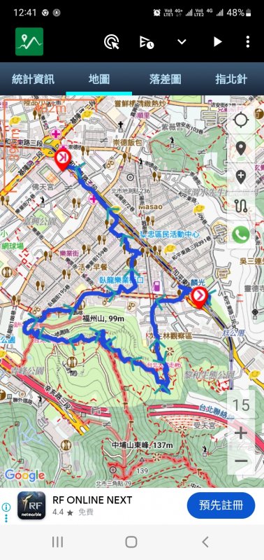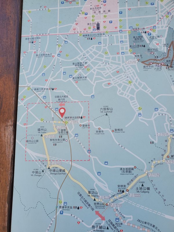 麟光捷運站>富陽生態公園>福州山公園>六張犁捷運站 Betty Shen 2025-08-29 發表 646 次點閱 6 次拍手 拍個手吧 收藏 檢舉 分享 分享至 Facebook LINE 一日行程 出發日期 2025/08/29 回程日期 2025/08/29 相關路線 福州山步道 、富陽自然生態步道 相關山岳 福州山 本文為網友的心得,以下內容不代表健行筆記立場。 Day 1 2025/08/29 10:05 麟光捷運站 10:10 地圖 10:12 大縱走第六段路標 10:16 富陽生態公園 10:17 涵洞 10:18 城市轉個彎,進入森林中 10:19 公園 10:22 木棧道 10:26 舊軍事用地 10:27 木棧道 10:28 步道 10:33 曝曬 10:35 四號涼亭 10:37 四腳蛇也來納涼 10:45 福州山公園 10:46 觀景台景觀 10:48 福州山基石 10:53 二號涼亭 10:54 景觀 10:56 步道 10:57 木棧道下 11:02 縫隙中的101 11:02 一號涼亭 11:04 木棧道 11:05 往卧龍街方向 11:07 樹蔭光影 11:09 福州山公園入口 11:51 找家小店用餐 12:17 六張犁捷運 12:41 軌跡https://hiking.biji.co/index.php?q=trail&act=gpx_detail&id=4903820