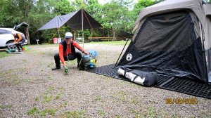 此時,阿旺隊長+黃表哥正忙著張羅露營相關事宜。整備好器材,準備架設3頂營帳+天幕+桌椅,趕緊加入組裝架設。夥伴們同心協力,合作無間。 黃表哥新添購的超大家庭式帳篷,北雁緊握打氣筒快猛使勁力充氣。好不容易撐架起來,又因接頭未鎖妥而消氣,又重新再來... 哈哈,當健身房鍛鍊囉!折騰一番,終於搞定。