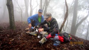 12:40 正當夥伴們討論提議:請黃表哥支援回頭去取水之際,北雁及時趕到了! 夥伴們歡心鼓舞 ~ 我們才剛到10分鐘,你真快耶! 哈哈 ... 隊長殷勤服務,忙著啟動高山爐具,展現熟練功夫~煮水泡麵+手沖藝技咖啡,北雁限量分享~威士忌非冷凝美酒,夥伴們分享茶點 = 醉美抒懷,逍遙似神仙唷!