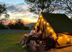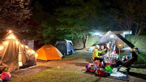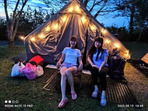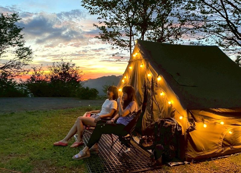營地帳棚天幕周遭,布置的照明安全燈飾亮起,氣氛格外迷人。