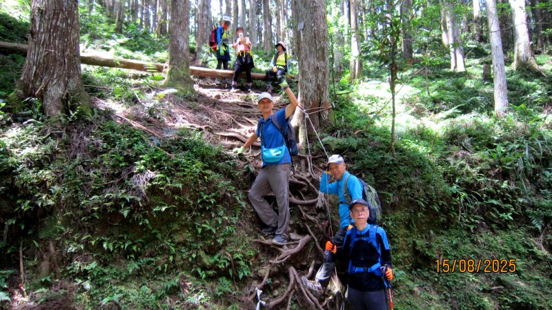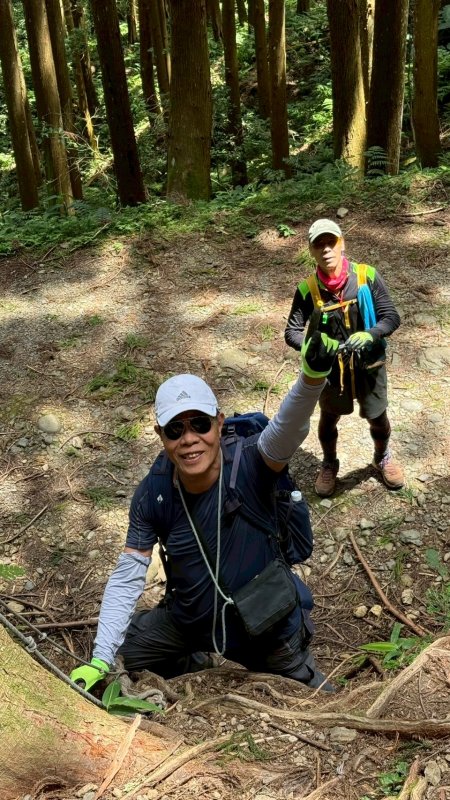 行至林道8K拉繩陡下處,顧慮他腿膝有傷恐不穩?北雁趕緊在前先下協助守護。