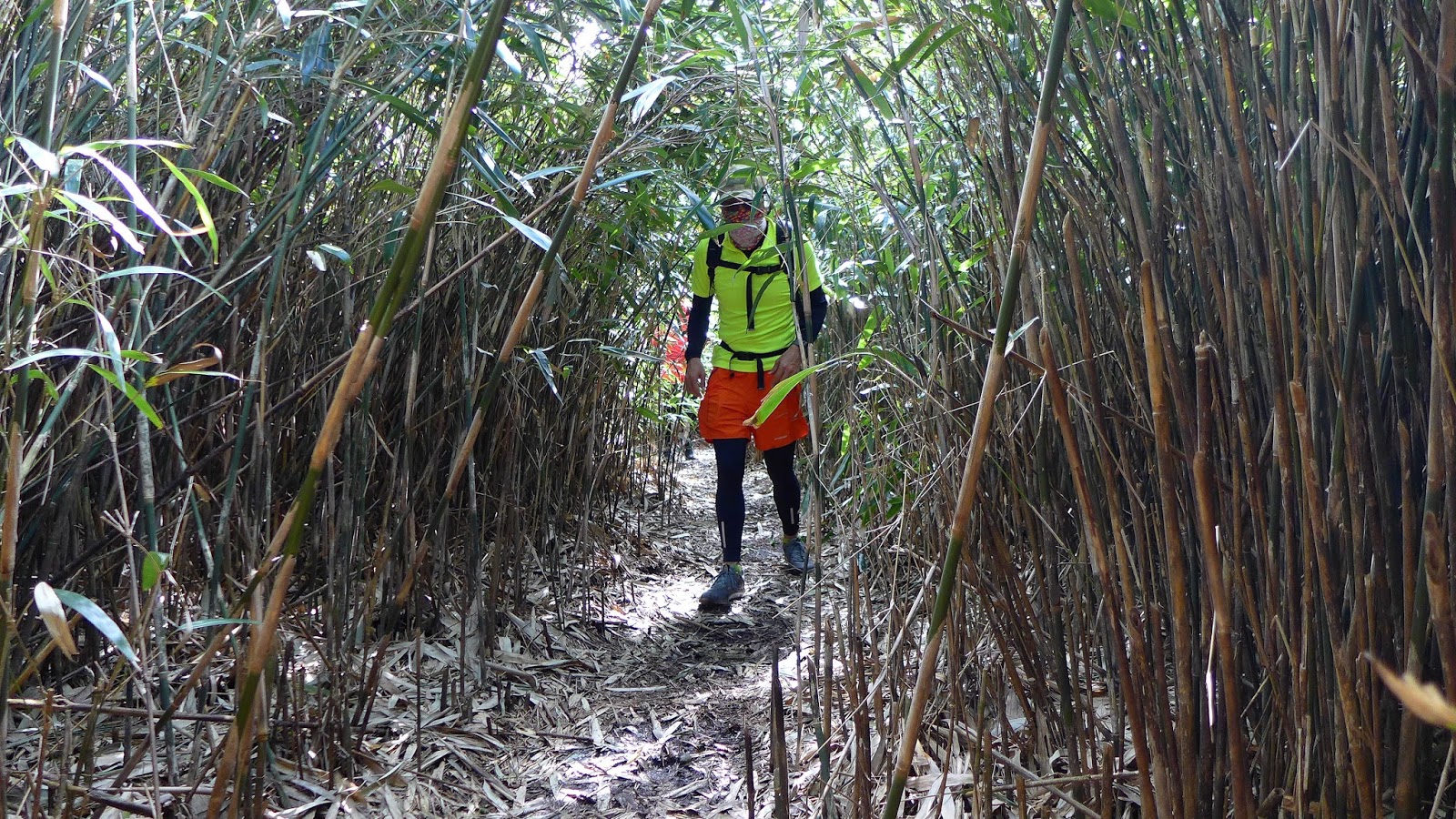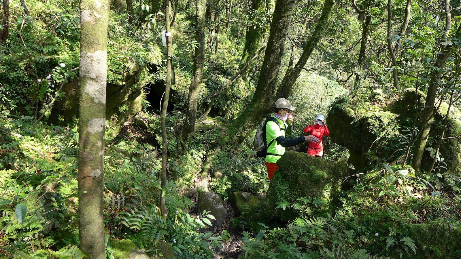 繼續行程,往凱達格蘭遺址跟恐龍接吻石,原本要去凱達格蘭遺址是可以很輕鬆的,只要退回叉路走過去一下就到,不過我想走走不一樣的,不想原路,決定下切到金露天宮的山腰路,從另一邊過去,這一下真是不得了,120M下降80,再滑溜溜的超陡下切山徑抓箭竹下切。