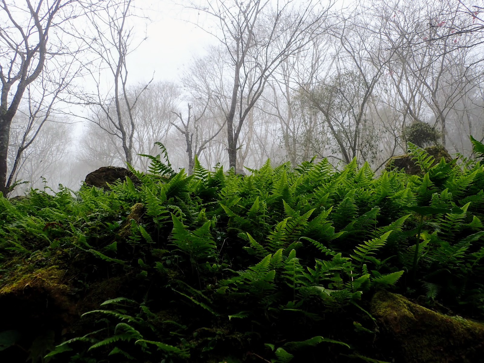 蕭瑟銀杏林只剩枯枝與綠意盎然的蕨正隨著季節替換