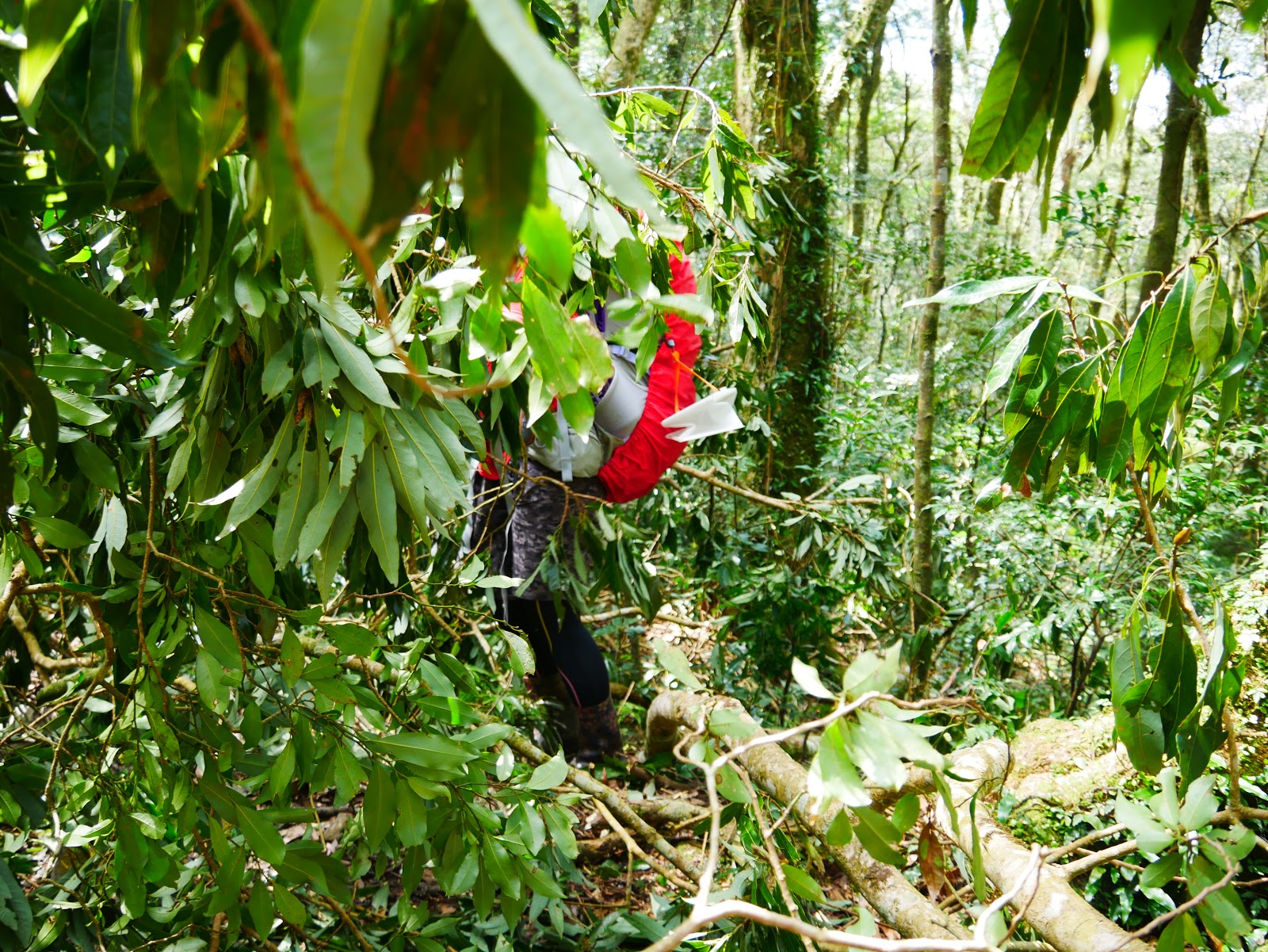 08:10 走到一處寬稜上,因為一直過新倒木,偏離了原來的路徑,有些小迷路,看了GPX應該往右平切叢林穿越,遂順利找到路徑和前人的布條。