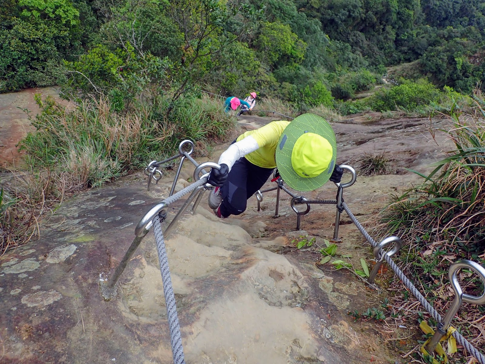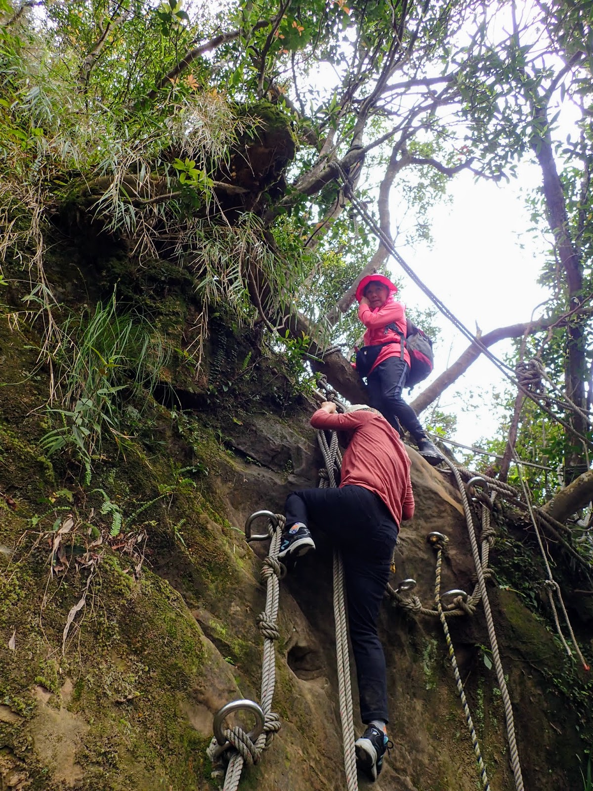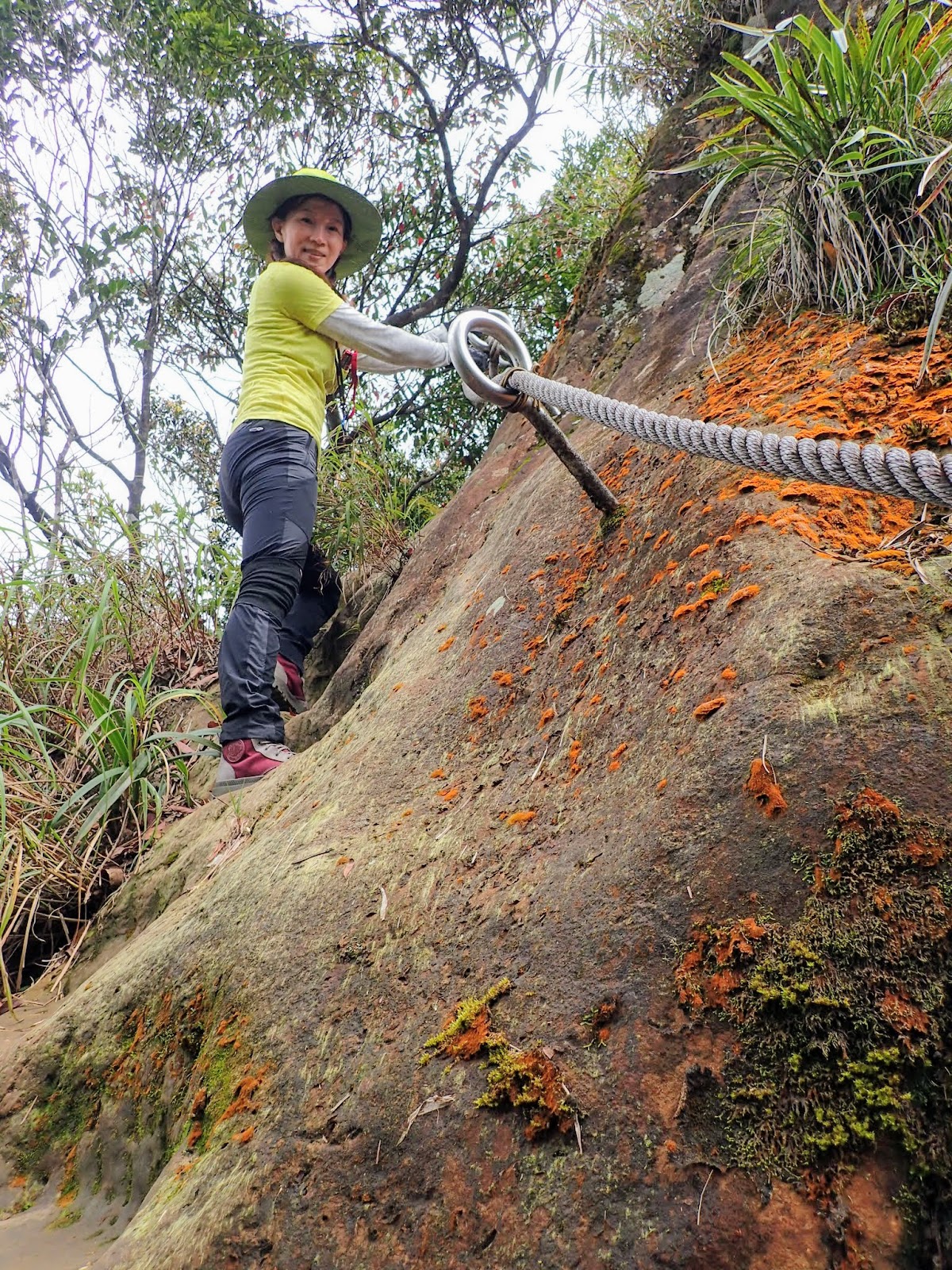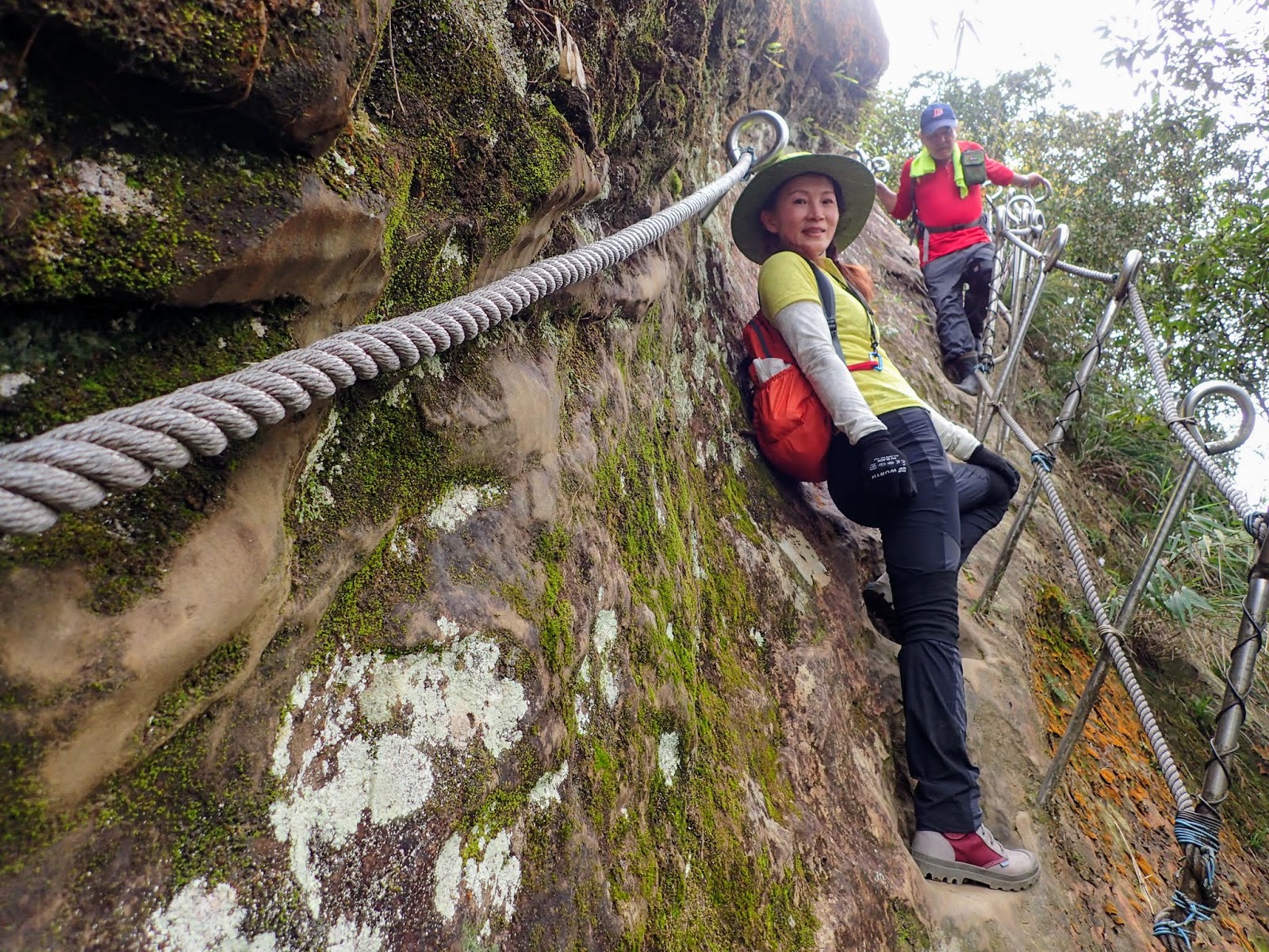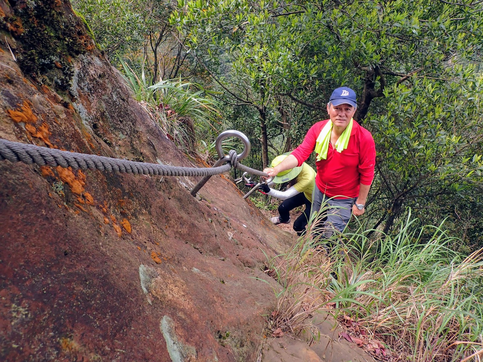 繼續往上攀爬陡峭的石壁, 好在踏點明顯還有鋼索可拉, 只要腳踏好手抓好, 沒問題的