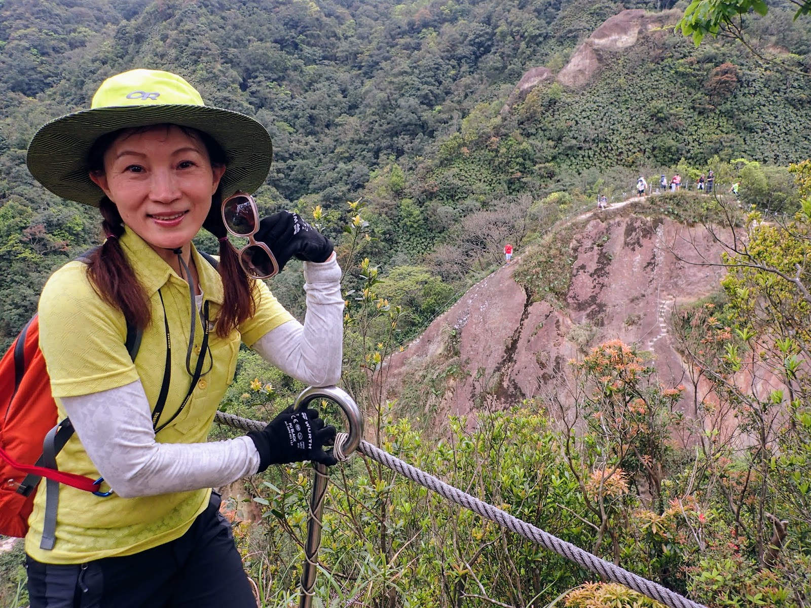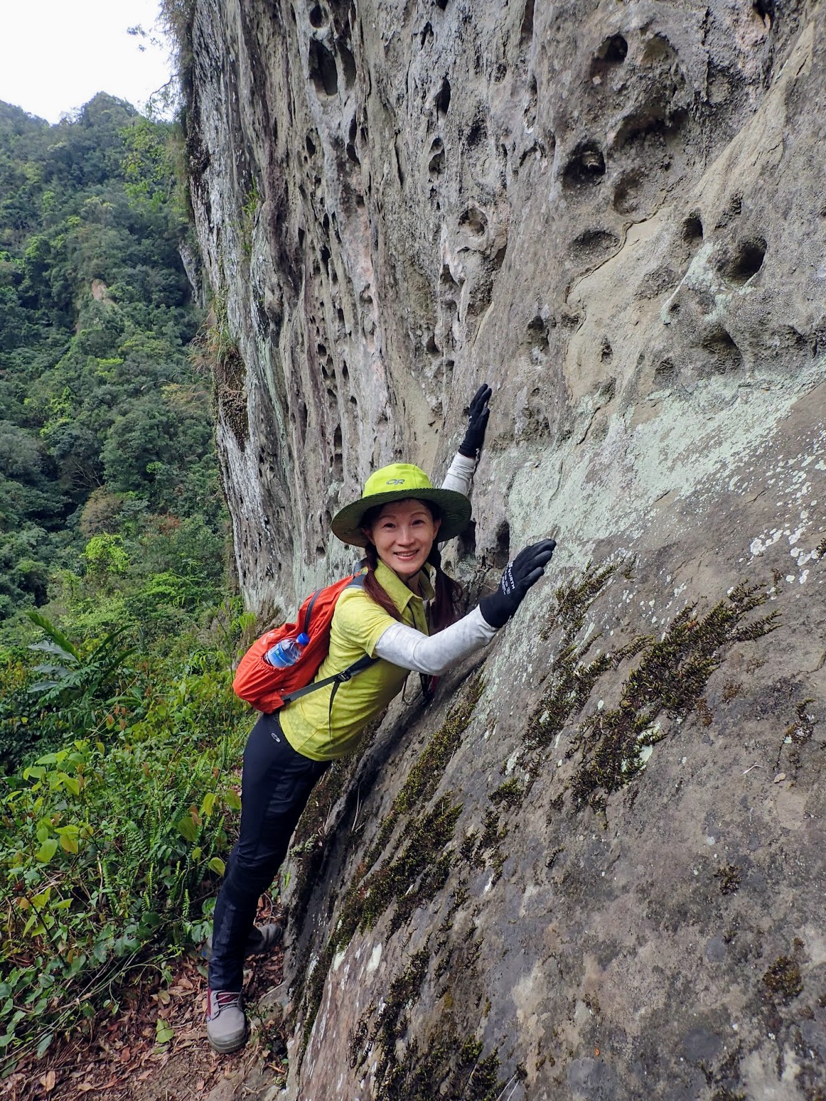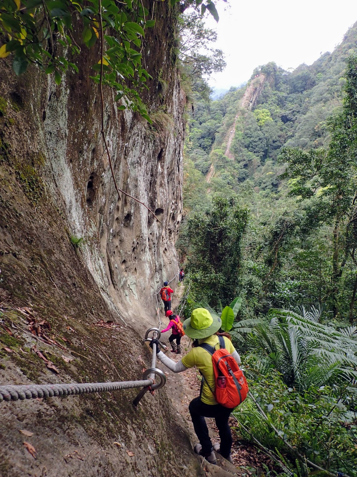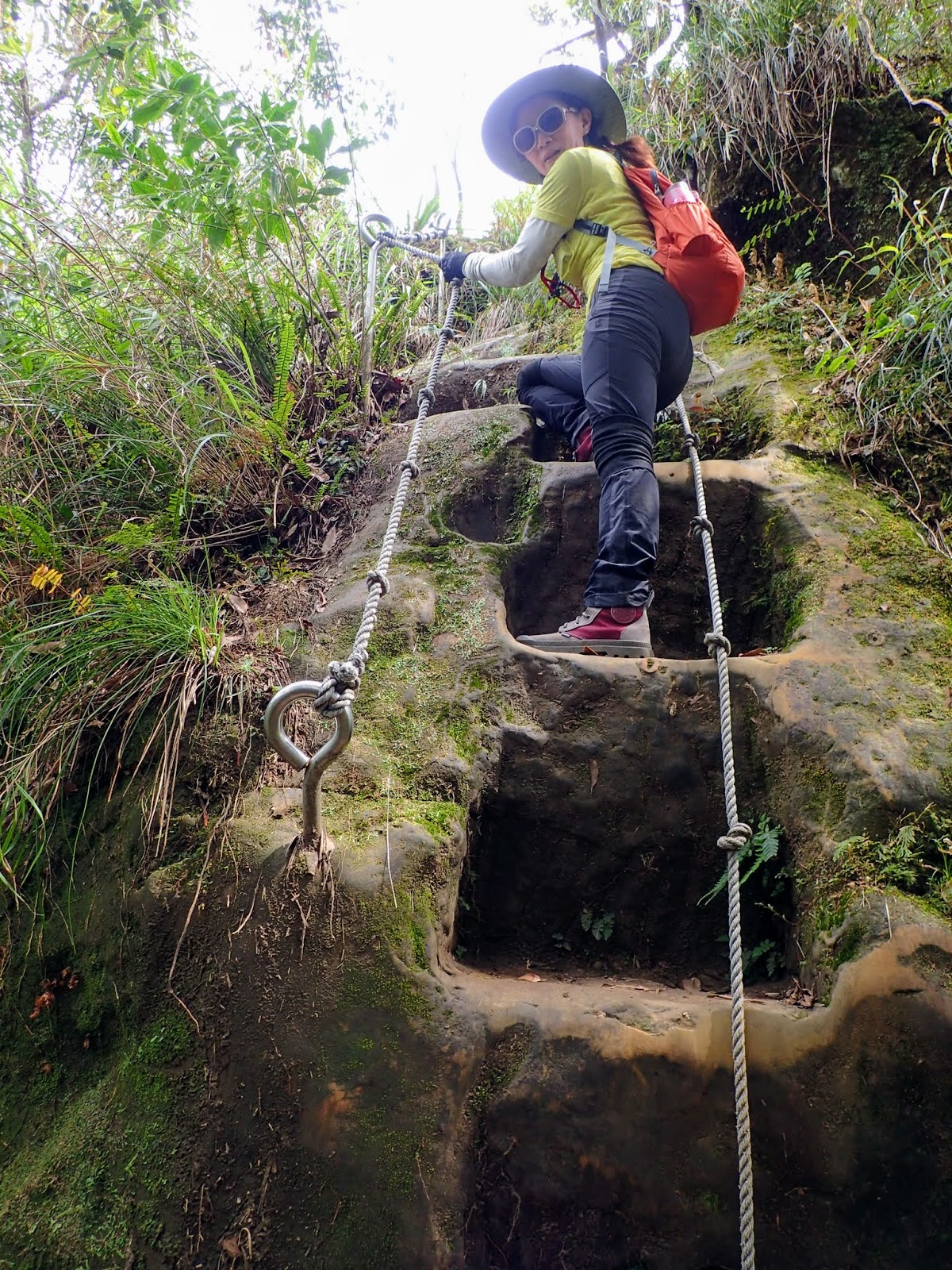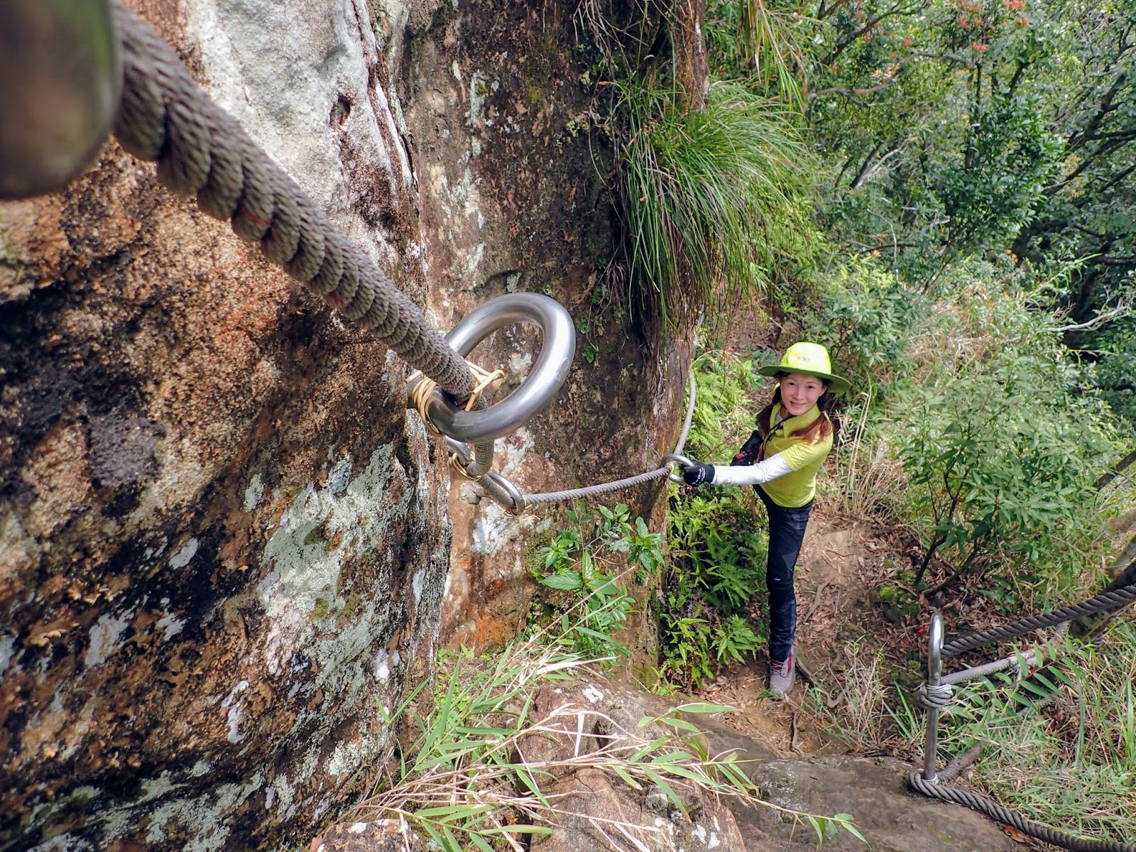 繼續往上攀爬陡峭的石壁, 好在踏點明顯還有鋼索可拉, 只要腳踏好手抓好, 沒問題的
