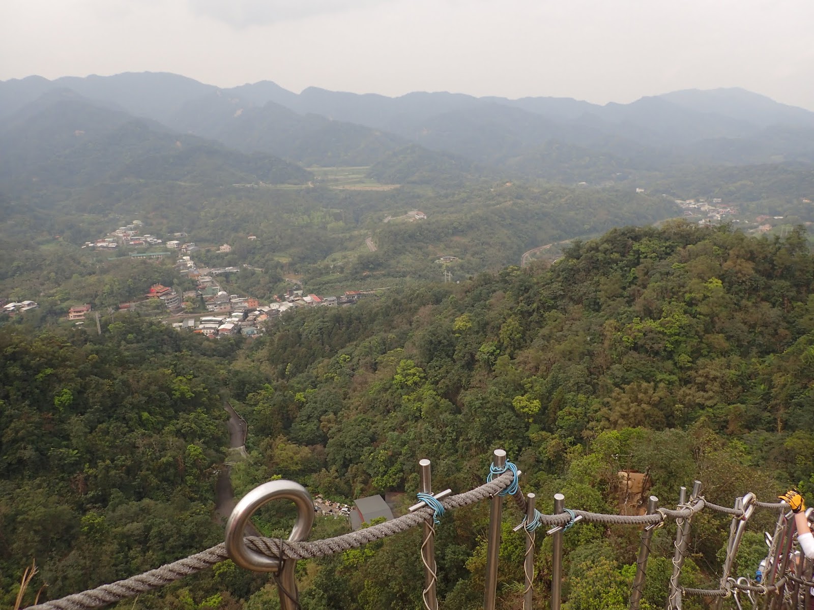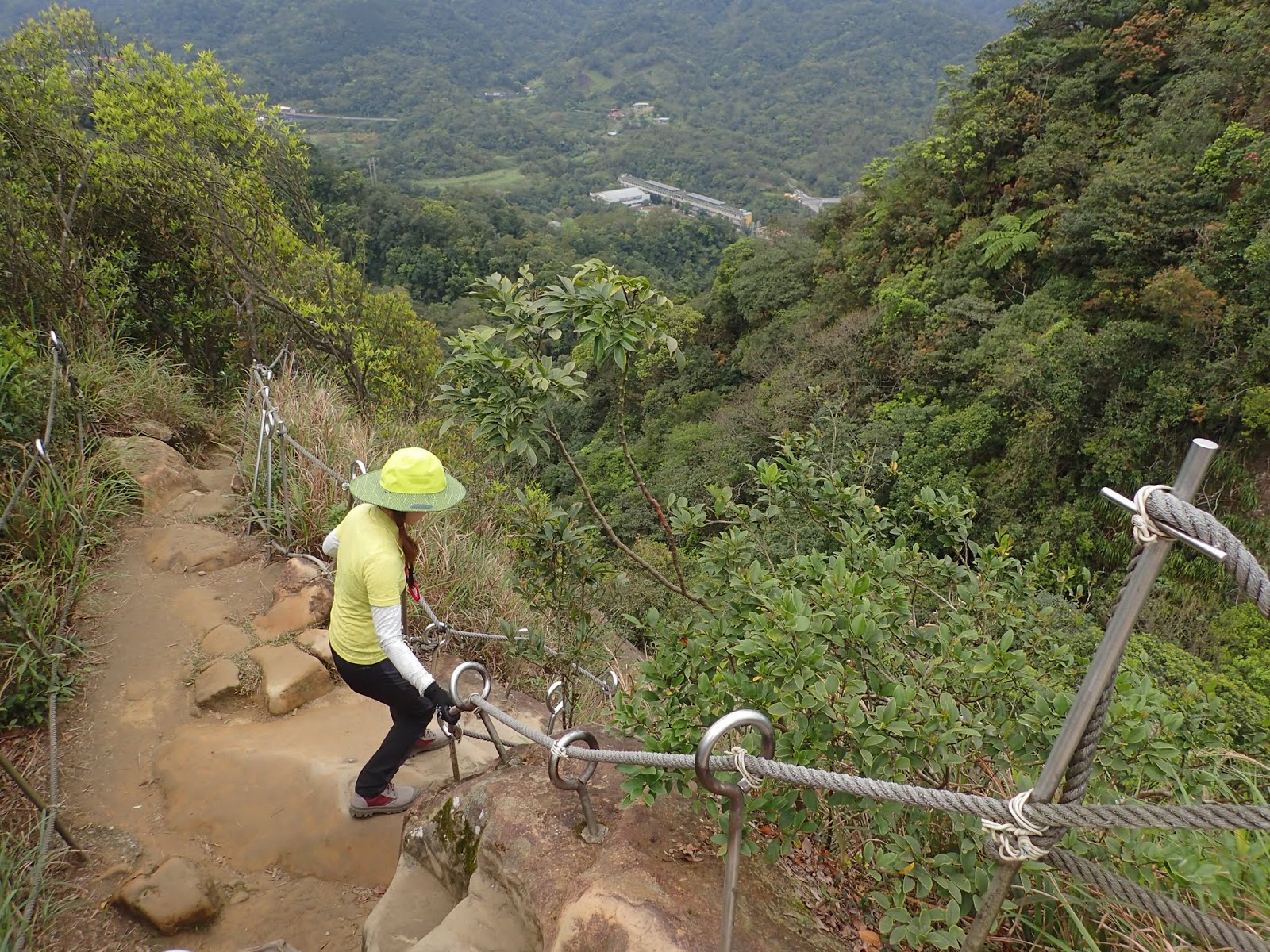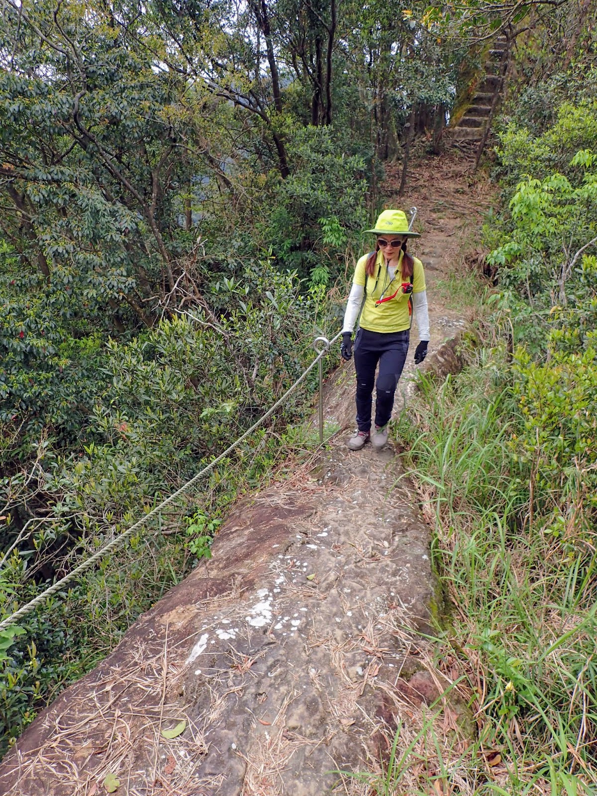 原路扶鋼柱走稜線下去, 膽子似乎有大了點, 比較沒有在心驚驚, 兩旁有綱柱不鏽鋼繩抓著, 真的讓人好安心啊