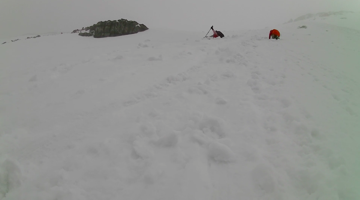 中午12點抵達雪山主峰,但山上天氣變化太快,一瞬間圈谷已經被雲霧遮住,連北稜角都已經看不到,只好取消在山頂吃午餐的計畫,先離開再說。而且下坡看起來很陡,看著志工和那位短袖外國人直接從山頂像溜滑梯(他們選中間的路線下滑)一樣直接滑到圈谷底,實在很讓人羨慕。不過昨天在山屋也有聽志工說別隊因為操作失誤,下滑時把臉撞的半邊瘀青,想到這裡,我們決定還是以我們有把握的方式下山...