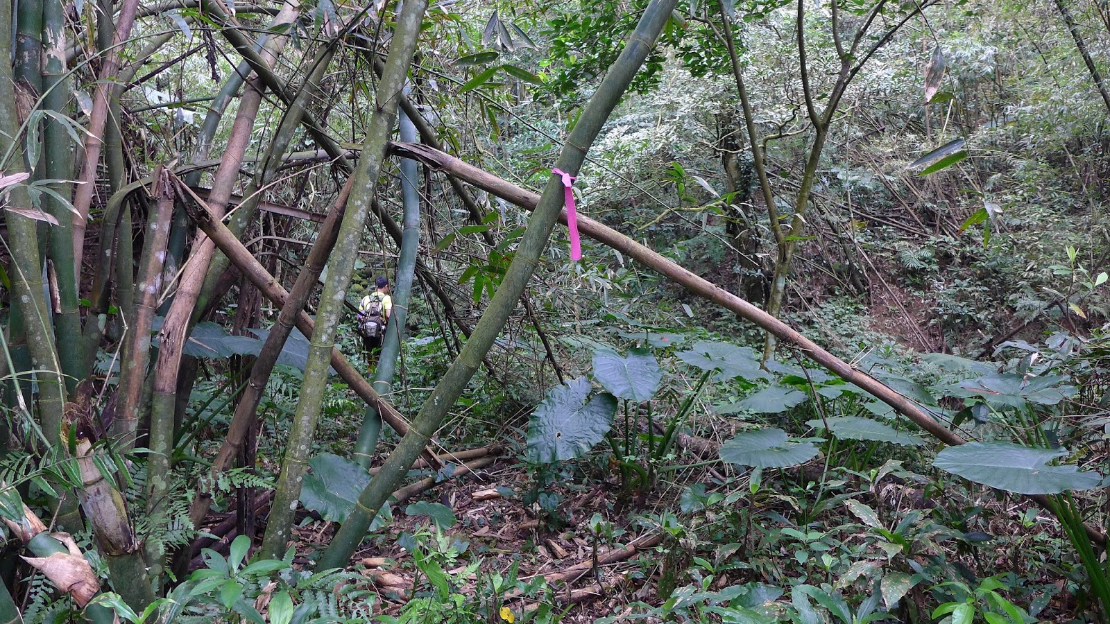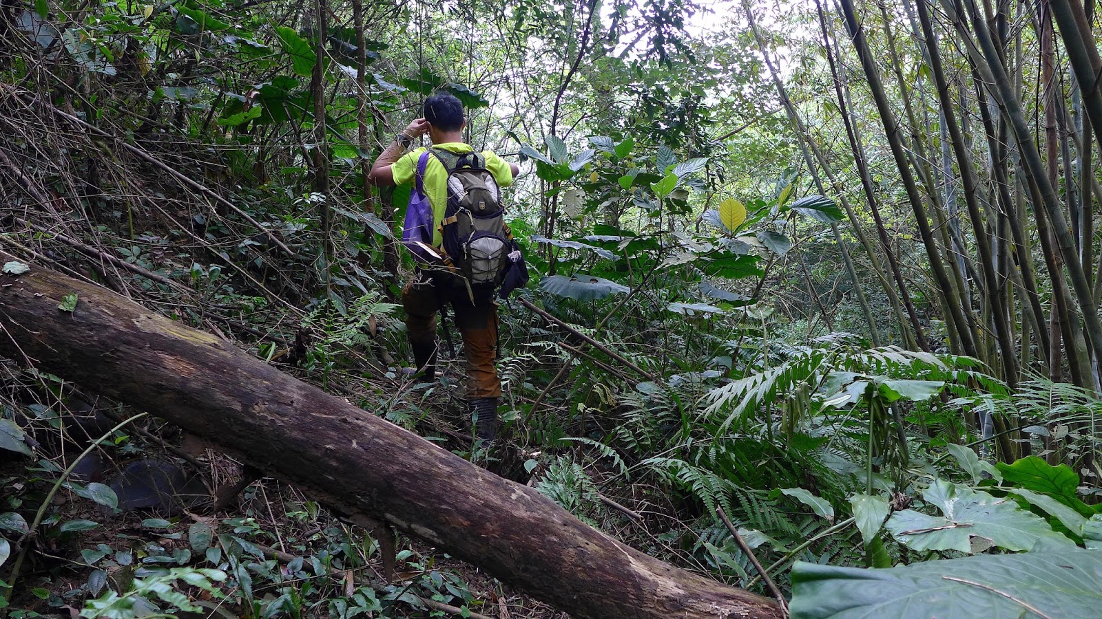 這段主線是先完飛沙縱走後才來開始走的,因此這段路包括後續其他行程只要進原始山徑山手上都不是拿登山杖,都是用枝葉在掃蜘蛛網,果然走起來舒服許多,不用一直撞到蜘蛛網在那邊撥來撥去,特別我又愛穿短袖...黏到手臂上也是挺不舒服的阿。
