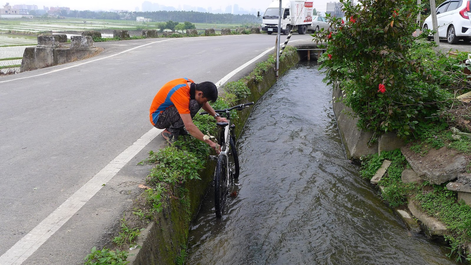 沿著竹22鄉道走,水圳道也一路沿著,因看到水車時稍停一下,一般經過可能不會注意到,梘頭圳,這是古早將頭前溪水經水圳引入灌溉,遇山谷或溪流所製的行水橋,又稱浮圳,古時讓水走的橋叫筧跟梘,前者為竹子製作,後者則是用木頭製作,後來以水泥建造行水橋,梘這詞直接沿用下來。