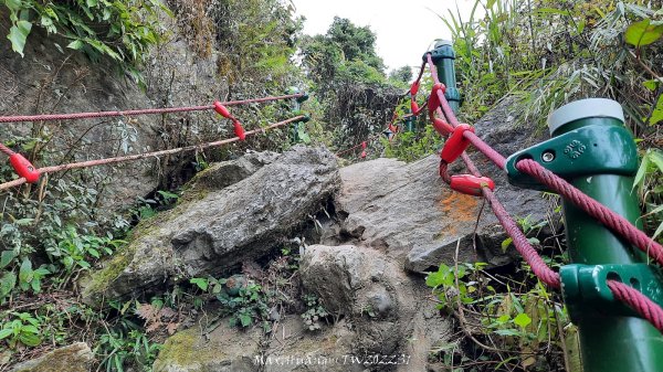 這段路徑脫離了初期的石板階梯,轉為充滿原始感的亂石路與土坡。由於坡度極陡,部分區塊近乎垂直,山友必須手腳並用,在交錯的樹根與嶙峋岩石間尋找踏足點。沿線皆設有堅固的輔助粗繩,需仰賴雙臂與核心力量穩住重心攀升。因地質包含礫石與砂土,雨後極易濕滑,極度考驗登山者的肌耐力與平衡感。