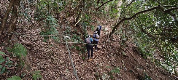 雖有架繩輔助但步道寬度狹窄且踏點鬆動,緊鄰步道旁有咬人貓容易誤觸。