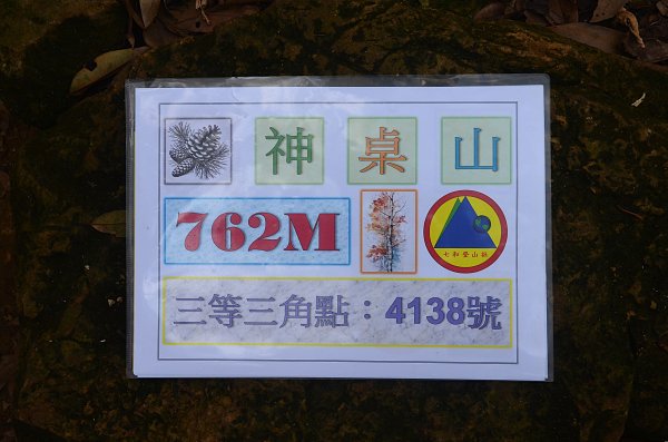 ● 神桌山:位於苗栗縣三灣鄉、南庄鄉與獅潭鄉交界處,標高762公尺,山頂立有一顆露土很高的『三等三角點:4138號』,其旁另有一顆由『南庄事業區』所立的造林水泥界石【界石四面刻有:『南庄事業區第三林班』、『民國41年9月27日許可:第1491號』、『造林人:溫錦堂』、『造林面積:256200公頃』,界石上端刻有一個『租』字】,樹上釘有『神棹山救援樁號:第4號』牌。『神桌山』因位處『象神仙縱走』路線的中間位置,所以部分山友會選擇『象神縱走』或『神仙縱走』路線。