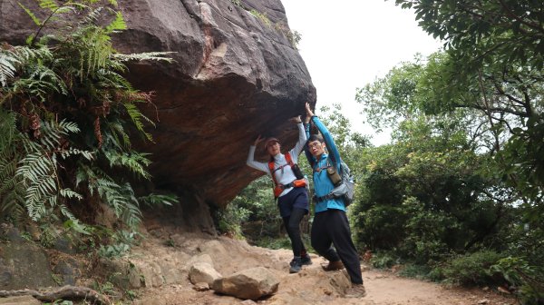 第1座東華山設有市291號基石,海拔35公尺,然後就要折返往反方向進前,沒多就到了第2座奇岩山西峰,設有北市三角點基石,編號14號,海拔67公尺,隔沒多遠是第3座奇岩山,設有市292號基石,海拔91公尺,走到稜線旁可以看到陽明交通大學的操場,位於學校內的最高處,這邊的視野很好哦,操場旁就是第4座唭哩岸山,沒有基石,海拔165公尺,山徑變成石階步道經過大學亭,順利抵達知名景點軍艦岩,巧遇登山隊在此休憩。