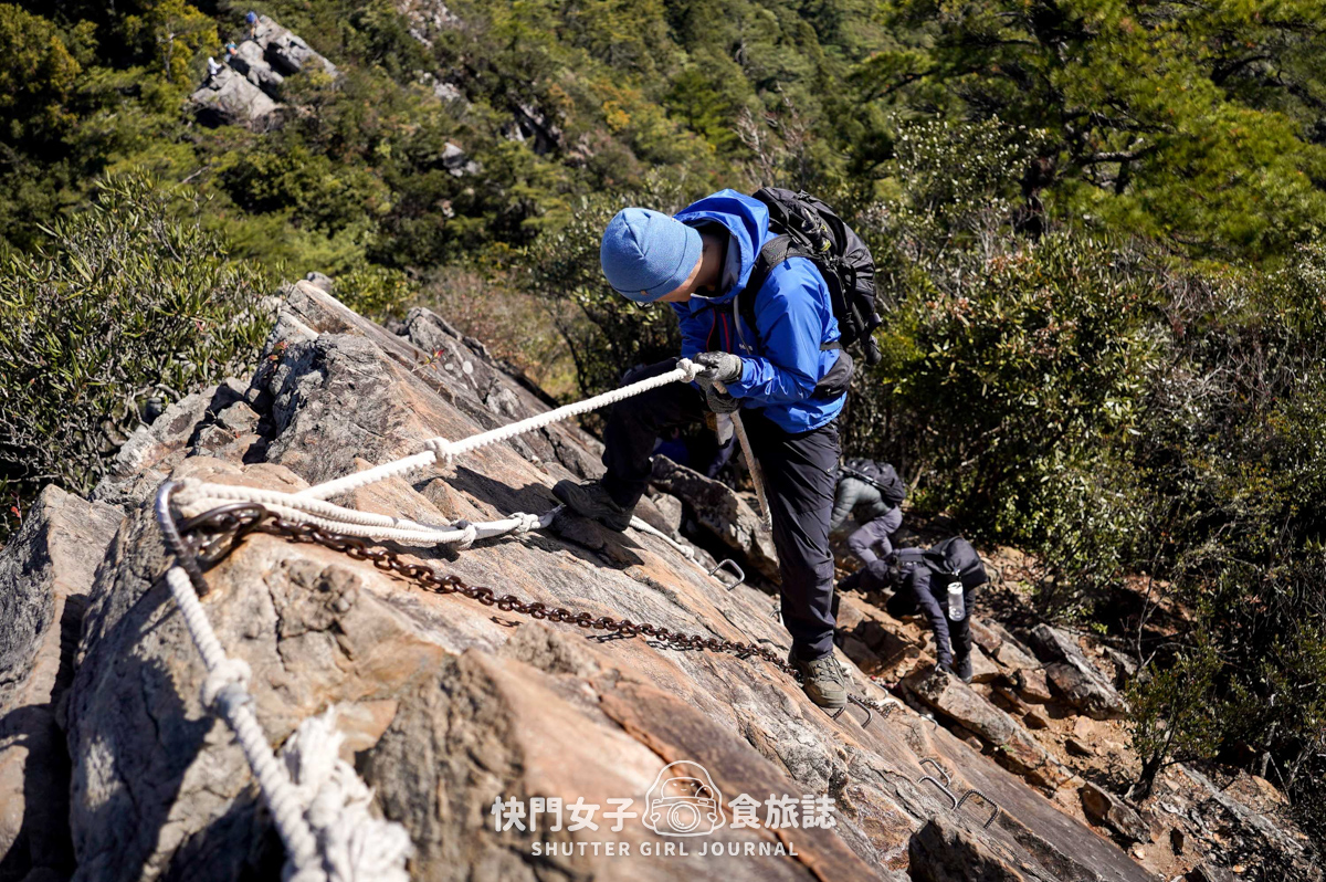 下鳶嘴山也不算容易,因為很多路段幾乎逼近垂直的石壁,各種繩子、把手都有,要不是拉繩垂直往下,就是手腳並用的抓岩石上的手把,也是一個滿耗心力的下山🤣