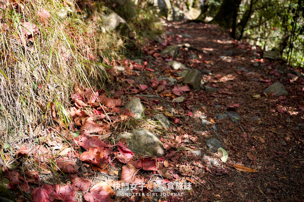 我們抵達時葉子已經是掉落在地上了,雖然沒有看到滿片紅的楓葉景色,但小徑上全都是紅色落葉也是一種美