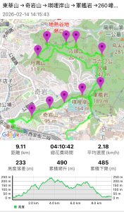 今天行程:MRT唭哩岸→東華山→奇岩山西峰→奇岩山→唭哩岸山西南峰→唭哩岸山→軍艦岩→ 260峰→八頭山→ 湯守岩→大師岩→湯海岩→丹鳳山→MRT石牌。17100步,約10公里,3小時50分鐘(不含休息)。