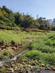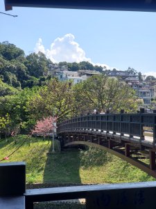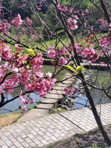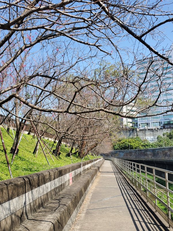 對岸櫻花已冒出綠葉