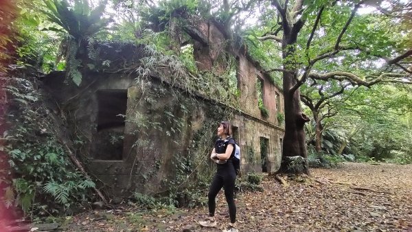 在三角點休個5分鐘、拍完照片,接下來就一路下山,但還有景點要去拍照,走出林道接上泊油路後,大約走200公尺切進石階步道,裡面有個廢棄古墟座落在林中,它有種荒廢古厝的美。▼