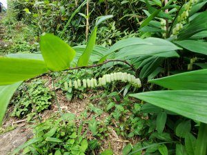 萎蕤-為百合科多年生草本植物,也是台灣原生植物,在清明前後開出淡黃的懸垂花朵,花由葉腋中長出,總花梗下垂,長約 2 公分,通常著花 3~5 朵。萎蕤的名稱與它的特性很貼切,因為它的地下莖發達,植株枯萎後,靠地下莖過冬。萎蕤在開花結果後,地上部分的莖葉會漸漸枯萎,只留下地下莖過冬.