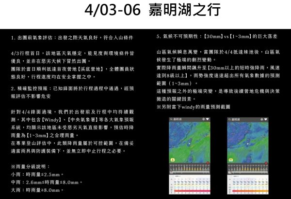 其次是【單一定點雨量預報的誤解與崇拜】,殊不知沒有任何一個世界各國氣象機構採納這種雨量預報法,唯獨Windy,Meteoblue,Ventusky等模式預報的氣象網站在使用,這些都是提供氣象愛好者研究大氣變化概況的工具¸ 並非取代氣象署等機構的天氣預報工具。氣象署每日定期發布未來48小時定量降水預報,而且是以台灣全島地圖來呈現降雨量與分布區域,從4/03早晚兩次發布資料來看,4/04全日24小時在嘉明湖周圍區域降雨量與分布範圍都明顯上修,而且是8-20時與20-08時兩個時段都看出降雨持續增強,降雨熱區夜間還移往南部山區,這樣的觀察是Windy 單一定點雨量預報絕對掌握不到的變化,氣象研判必須始終以防災視角來閱讀所有的氣象圖表,不能始終處在見樹不見林的狀態下運行而不自知,登山者的安全是很容易受到劇烈天氣的威脅。